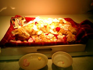 2003年6月24日18時 葬祭場でブーと最後のお別れ。 バラの花びらで飾られたブー、最後の姿。 お別れの曲は「アメイジンググレイス」。 こんなに痩せて小さくなるまで病気と闘って 本当によく頑張ったね。 今まで楽しい日々をありがとう。 でも、やっぱり悔しいよ。ブーを守ってあげられなくて。 もっとお家にいたかったよね。 もっとみんなと一緒にいたかったよね。 ごめんね、ブーたん。天国で待っててね。 |