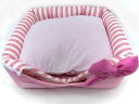 猫用のハウスにするか、ベッドにするか迷った時はありませんか?そんな悩みを解消するのがこちらの商品です。四角いハウスは中の座布団を外してぺしゃんこにしボタンを一箇所パチンととめればあっという間にベッドに早代わりです。ふかふかの座布団は無地とシマシマのリバーシブル。ピンクのリボンはピンが付いていますので、お好きなところにつける事ができます。全体のデザインもかわいらしく出来ていて、無地とストライプの間には白いレースのフリルもついています。汚れたら、手洗いで洗濯もできます。