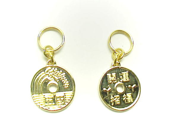 チャーム仕入れ担当の啓太君と問屋さんが「猫に小判っていいよねー」ってやけに盛り上がってご用意する事になった小判のチャームです。文字は片側に「交通安全」、反対側に「開運厄除」と入っています。招き猫が手に持っている小判をチャームにしちゃったそうです・・・・・。和風柄にいいかなぁ・・・・。