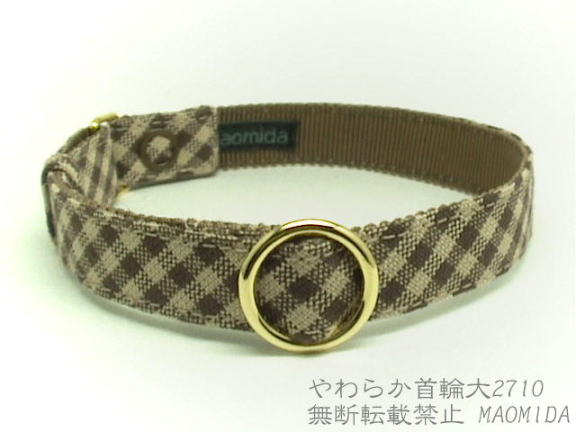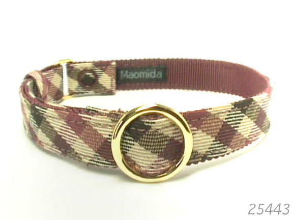 茶色と黒の千鳥格子柄の首輪です。英国紳士のような気品のある首輪になりました。千鳥格子は英国の伝統柄ですが、茶道の千利休も好きだった柄だそうです。いい意味でしぶい。