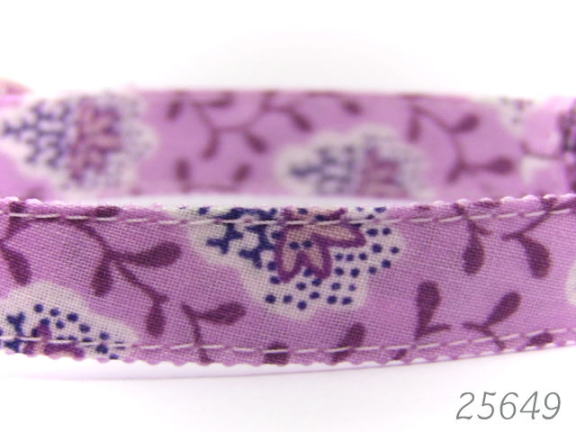 紺地に白、赤などのチェックです。カラーパーツ紫をあわせました。以前、私の父親になんとなく紺色チェックのシャツをプレゼントしたら、みんなにすごく若く見える!とか、かっこいい!って大好評だった事がありました。まさにこの首輪のような紺チェックです。それ以来、父親へのプレゼントは必ず紺チェックのシャツと決めています。猫ちゃんもこの首輪で若々しくかっこよく見えるといいなぁ。