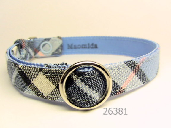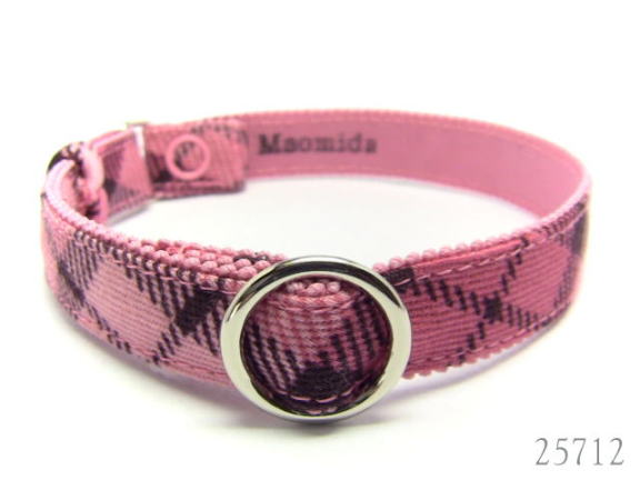 ベージュと黒と赤のチェック柄の首輪です。バーバリー風な色です。私はブランドものとか全然わからなくて、せっかく免税店やアウトレットに行っても商品がたくさんあって目がまわってしまうのですが、バーバリーだけは知っていて、いつも「これは知ってる!バーバリー!」って叫ぶ事にしています。お父さんのコートの内側の柄ですね!