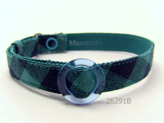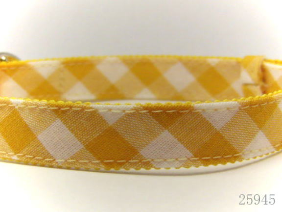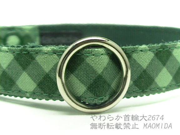 緑色のギンガムチェックです。最近、緑色がはやっているみたいですね。いつもおかしな柄の首輪ばかり作っていると、たまにはシンプルな首輪も作りたくなる今日このごろです。