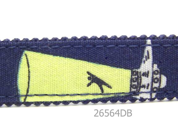 紺地にUFO柄の首輪です。白いUFOから黄色、ピンク、水色の光が出ていて、吸い込まれていく人影が見えます。人影は、一人、二人、三人のパターンがあります。私なら一人で連れ去られるより、二人以上で連れ去られるほうがいいかな?いや、相手によるかも…。