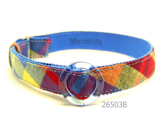 赤紫に近い赤、空色、ミントブルー、ベージュなどのマドラスチェック柄の首輪です。猫の首輪工房を始めた頃(2003年)からずっとマドラスチェックが大好きで、本場のマドラス(インドのチェンナイ)にマドラスチェックを買いに行きたいと言い続けてきて、まだ実現できていません。コロナも落ち着いてきたし、計画を立ててみようかと思います。