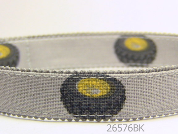 薄いグレー地に小さいタイヤ柄の首輪です。カラーパーツ黒をつけています。タイヤの数は一個の首輪で4〜5個です。黄色いホイール付き、タイヤのメーカー、インチは不明。表面がボコボコしているタイヤなので悪路での走破性は高そうです。