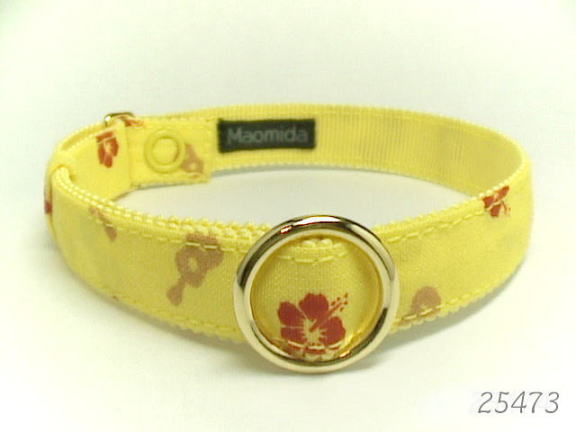 南国のお花を言えば、やっぱりハイビスカスです。リアルなデザインで首輪の幅にあう素材をみつけました。赤と緑のコントラストがちょっとまぶしくて、こちらのサンプル画像の首輪を縫うとき縫い目が少しヨロめいてしまいました。本番ではきちんと縫いますのでご安心ください。