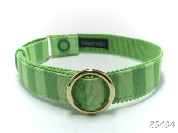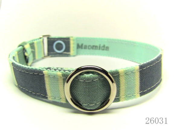 きみどりと薄い青の縦縞柄の首輪です。黒猫にも茶トラにも焦げ茶色にも、どんな毛色にもマッチしそうかも、の首輪です。