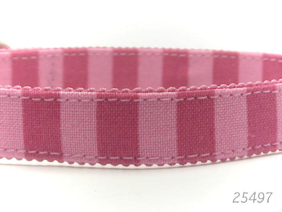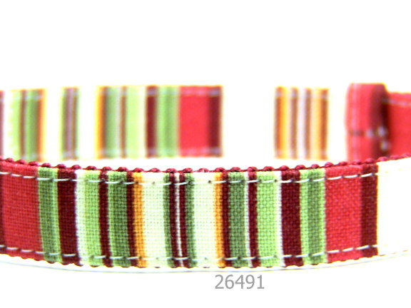 白、赤、ピンク、緑、青、グレーなどのカラフル縞柄の首輪です。裏地とカラーパーツをビビットなピンクにしていますが、お好みで青系、黄色系にも変更可能です。変更希望の場合は、コメント欄等でお知らせください。