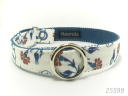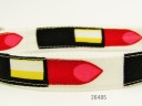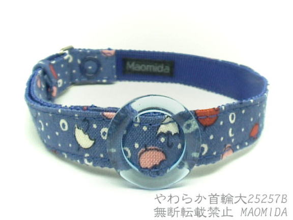 紺色地に赤いダルマのダルマ落とし柄です。ダルマ落としとは、積み上げた木片の木づちなどで打ち飛ばしていくおもちゃです。首輪にしちゃうとなかなかダルマ落としだっていうデザインがわかりにくいですが、ダルマの表情がそれぞれ違うところが面白いです。