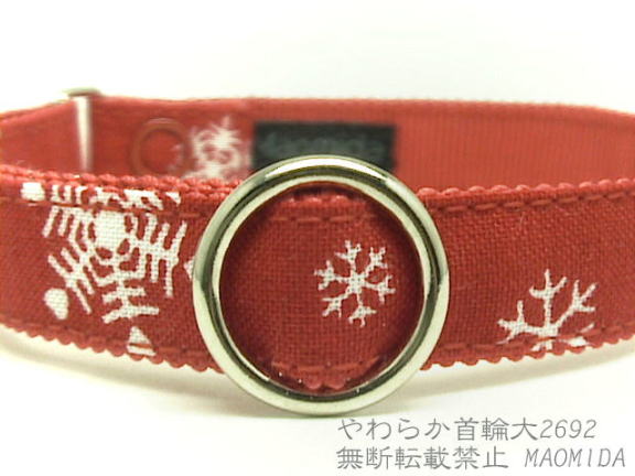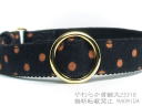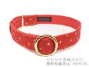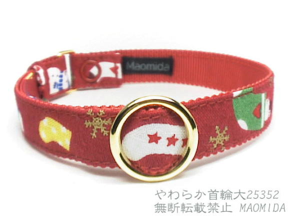 赤地に赤・金・緑などのクリスマスカラーの水玉柄の首輪です。
