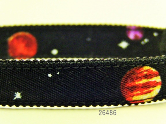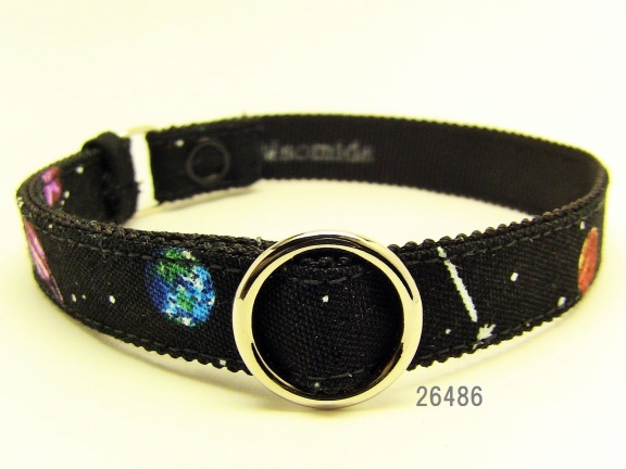 黒地に太陽系の惑星柄の首輪です。なんとなく地球っぽいもの、木星っぽいもの、土星っぽいものが見えます。世界一、いや、宇宙一かわいい猫ちゃんにどうぞー。