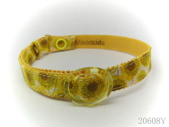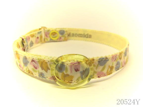 黄色地に白いデイジー柄の首輪です。花芯はブルーやグレーです。
