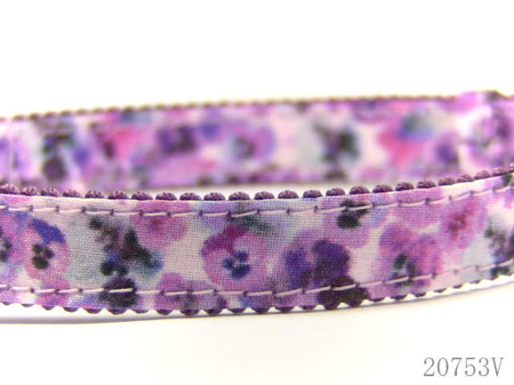 茶色地に紫色のデイジー柄の首輪です。ほんの少しふわっとした手触りの起毛素材です。茶色と紫って意外と色合わせがいいですね。