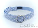 紺地に白いデイジー柄の首輪です。デイジーは全般的には白ですが、よーく見ると花びらはすごく薄い水色で、花の中心はすごく薄いピンクに見えます。