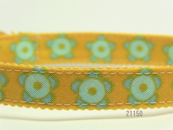 濃い黄色地に水色花柄の首輪です。1960年代に流行したターゲットマークという大きな丸の中心に小さな丸のデザインがあるのですが、こちらの花の中心もターゲットマーク風なので、なんだかレトロモダンな雰囲気があります。
