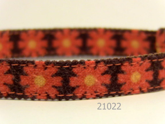 茶色地にオレンジのデイジー柄の首輪です。ほんの少しふわっとした手触りの起毛素材です。デイジーは、濃いオレンジ色です。