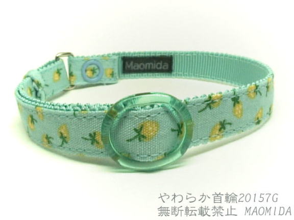 薄い緑地に太いネギで有名な群馬の下仁田ネギ柄の首輪です。カラーパーツは黄緑色をつけました。特にこの素材が下仁田ネギのデザインだというわけではないのですが、ネギにしては太かったので、太いので有名な下仁田ネギか西洋ネギのリーキに見えるなぁと思って、個人的に好物な下仁田ネギ柄という事にしました。