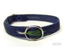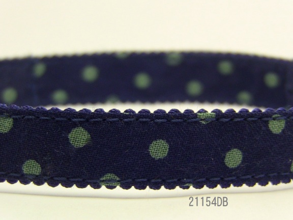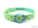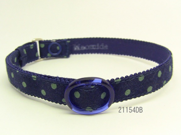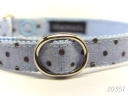 こちらも、さわやか〜な水玉です。↑の柄の首輪と同様、金属パーツを装着予定でしたが、サンプル作成の時にカラーパーツを着けちゃいました。濃い青のスケルトンのパーツがいい感じです。金属パーツに変更の場合は、50円引きです。金属パーツは特にご指定がなければ銀色になります。