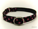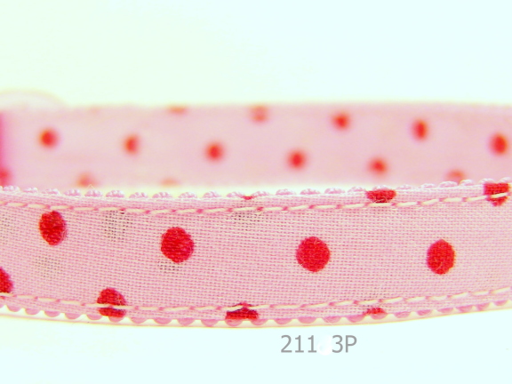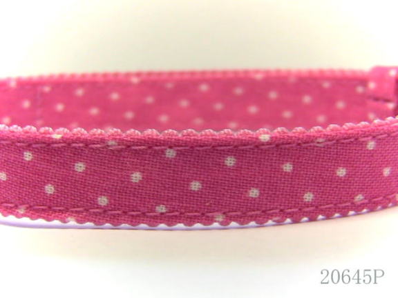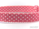 赤紫色地に濃いピンクの水玉柄の首輪に、カラーパーツ濃いピンクをあわせています。ラズベリーっぽい色で、ちょっと美味しそうなイメージに見えるのは私だけでしょうか?
