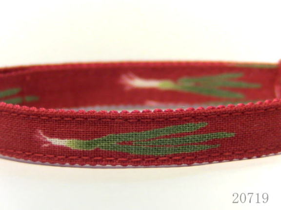 オフホワイトの白地に赤いトウガラシ柄の首輪です。たまに断面が見えているトウガラシもあります。素材の都合上、首輪一個につき一箇所つなぎ目があります。ほとんど目立たないですが、ご了承ください。ちなみに個人的には辛い食べ物は苦手です。