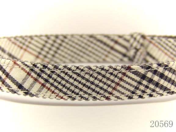 ベージュ地に、赤、黒などのチェック柄の首輪です。
