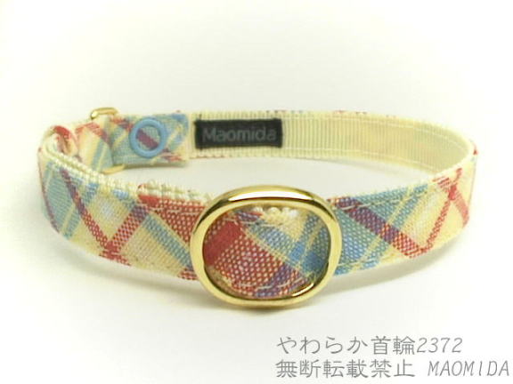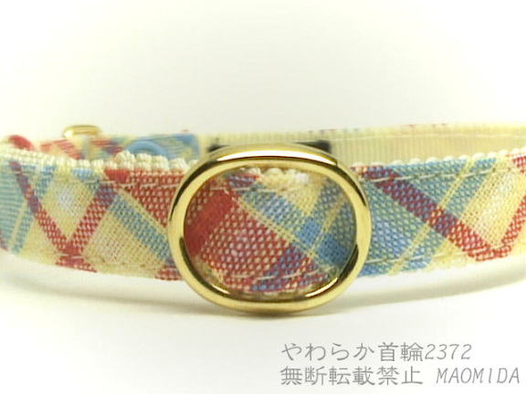 ベージュ地に、赤、黄、緑、紺などカラフルなチェック柄の首輪です。
