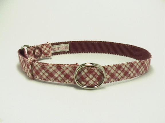 赤紫色地のタータンチェック柄の首輪です。カラーパーツ濃いピンクを装着しています。チェック柄の素材は、首輪にはなかなか使いづらい大きい格子のチェックが多くて、こちらの首輪のチェックのような細かいチェックはあまり多くはありません。細かくて色も良いチェックをみつけた時は、お宝をみつけた気分になります。